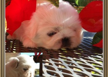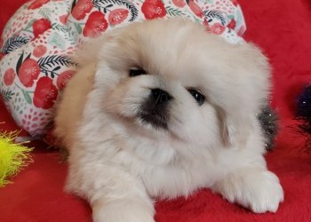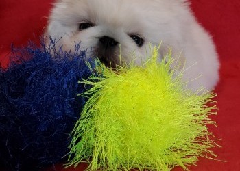 Great personality. Romance is a laid back white male with lots of soft fluff. He's the quality of a Pekingese you would see in the show ring. If you like grooming, he's for you. He's solid in boning. He'll probably be a full 14 lbs. or possibly more when neutered. All pups are up to date on vaccinations, vet examined, health certificate, fecal, last vet booster provided and rabies. Nanny service within 5 hours of Argyle, TX is available, otherwise it's pick up by car with an ice pack in Argyle, TX.