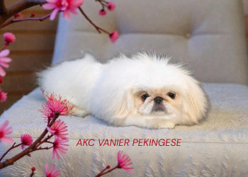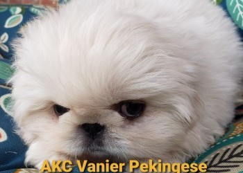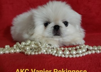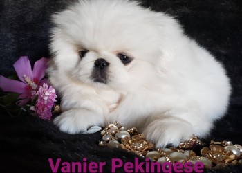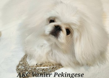 Vanier breeds for the rare white variety, good facial roll, confirmation and movement. Occasionally, colored pups are born. If you are looking for a pet quality Pekingese that does not have correct confirmation; bulgy eyes, 30 lb. dogs with an underbite, poor temperament and heart issues you came to the wrong place.